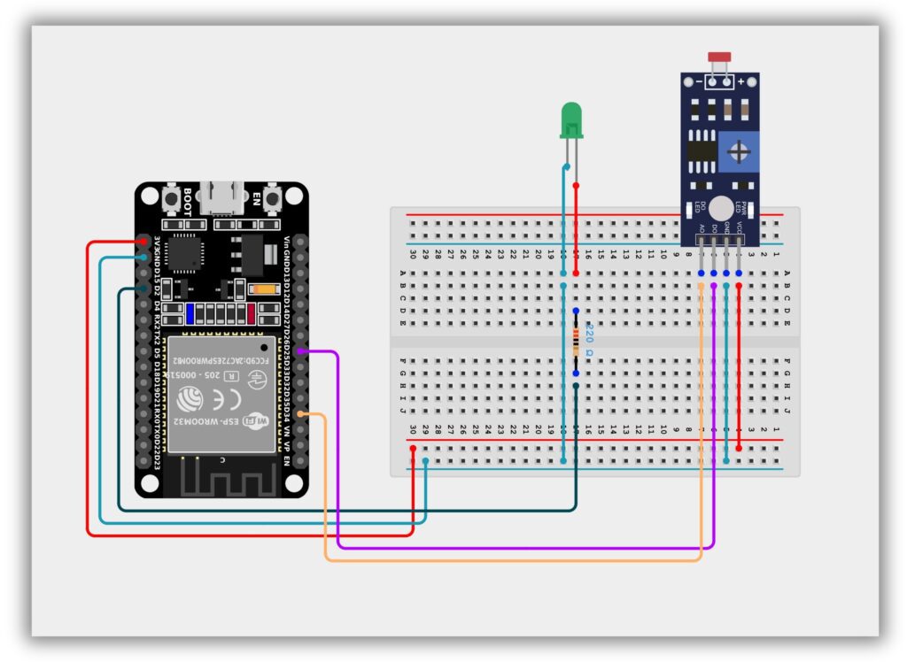 - If light is detected (digital output LOW), the LED connected to GPIO 2 turns ON; otherwise, in darkness, the LED turns OFF.