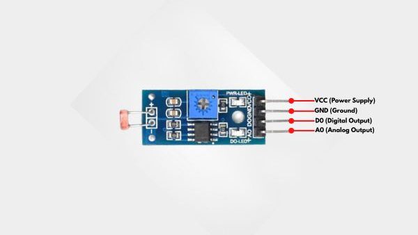 LDR sensor module is used to detect light intensity. It uses a light dependent resistor along with a comparator circuit, which provides both analog and digital output. The working of the LDR sensor module is simple. When light falls on the LDR, its resistance changes. The analog pin gives a continuous value based on light intensity. The digital pin compares this value with a preset level set by the potentiometer and gives a HIGH or LOW output.